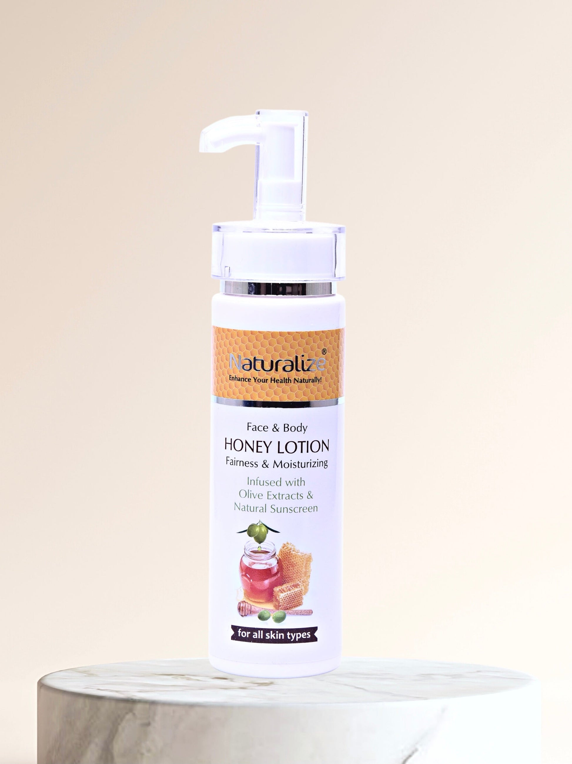 Infused with original honey and olive extracts, Naturalize Honey Lotion is extremely moisturizing and hydrates driest of skin. This product is contains natural sunscreen and healing properties while it is naturally soothing, it nourishes damaged skin and fades acne scars.
