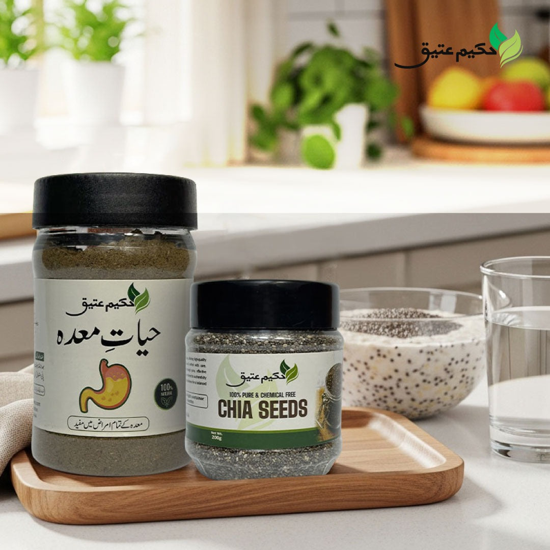 Experience the perfect harmony of nutrition and digestion with this powerful herbal combo by Hakeem Ateeq. Carefully crafted to support your health from the inside out, this combo brings together two of the most effective natural products: nutrient-rich Chia Seeds and the fast-acting herbal digestive tonic, Hayat-e-Maida.