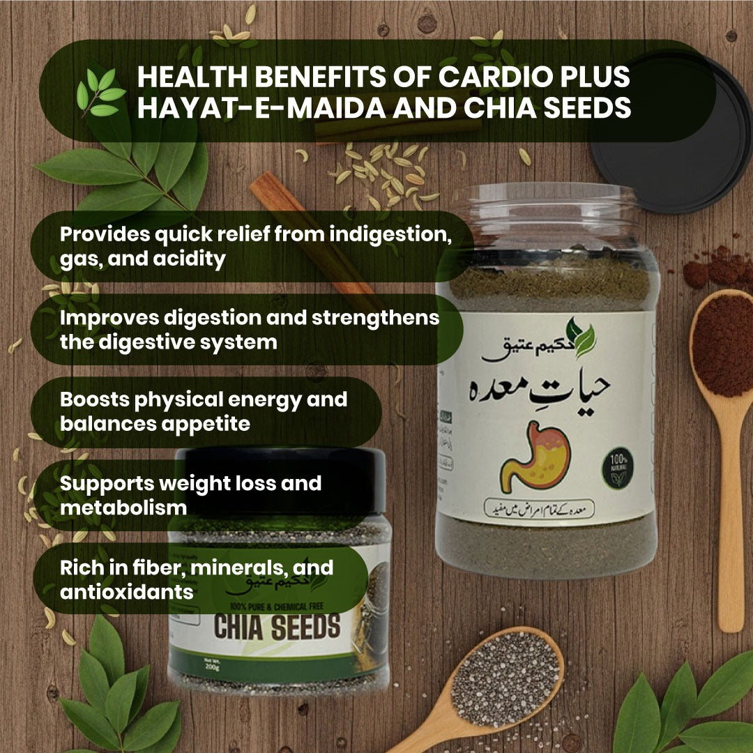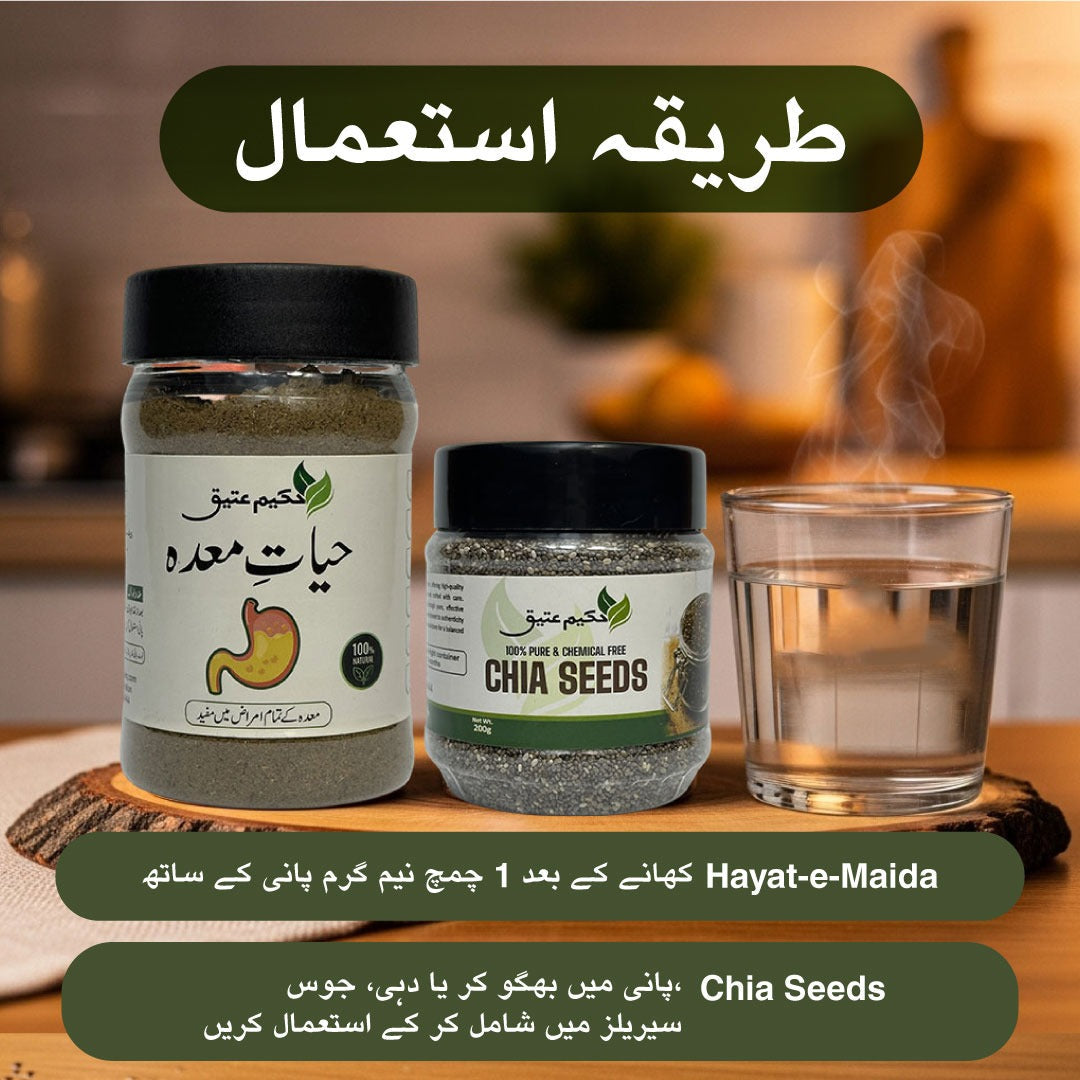 This duo offers dual-action wellness support—while Chia Seeds nourish your body, Hayat-e-Maida ensures your digestive system is functioning properly to absorb and benefit from those nutrients. It’s the ideal combination for anyone looking to maintain energy, reduce digestive discomfort, and improve overall health naturally.