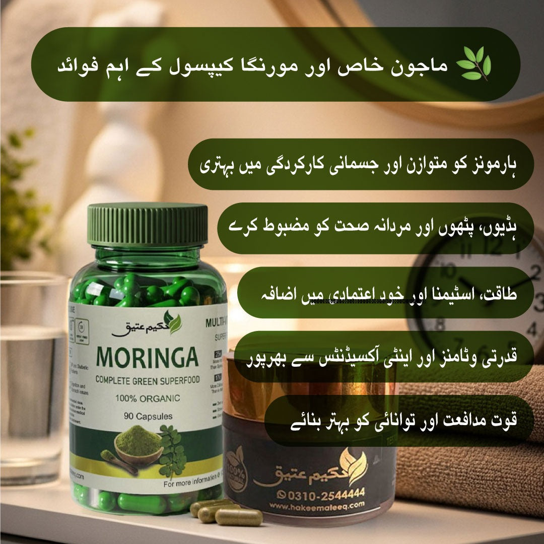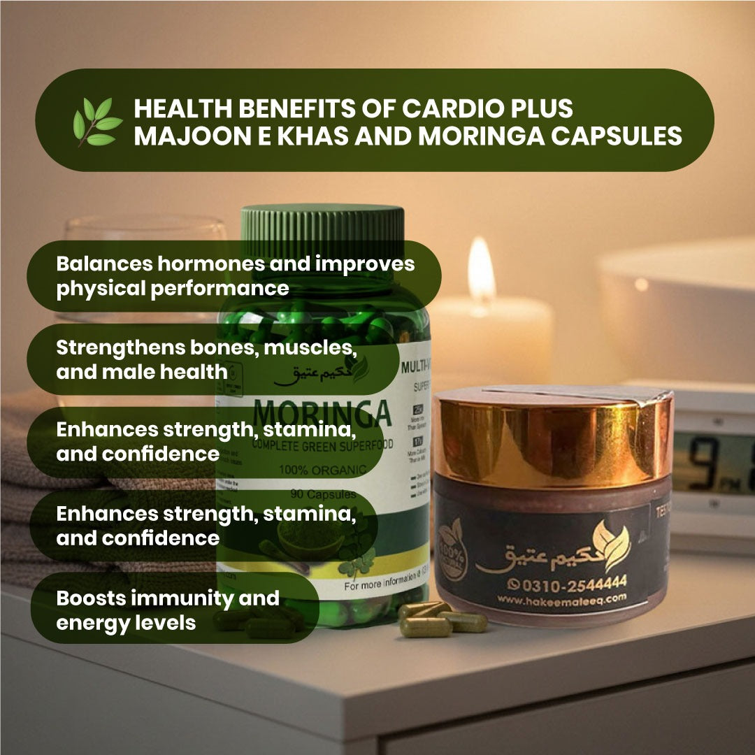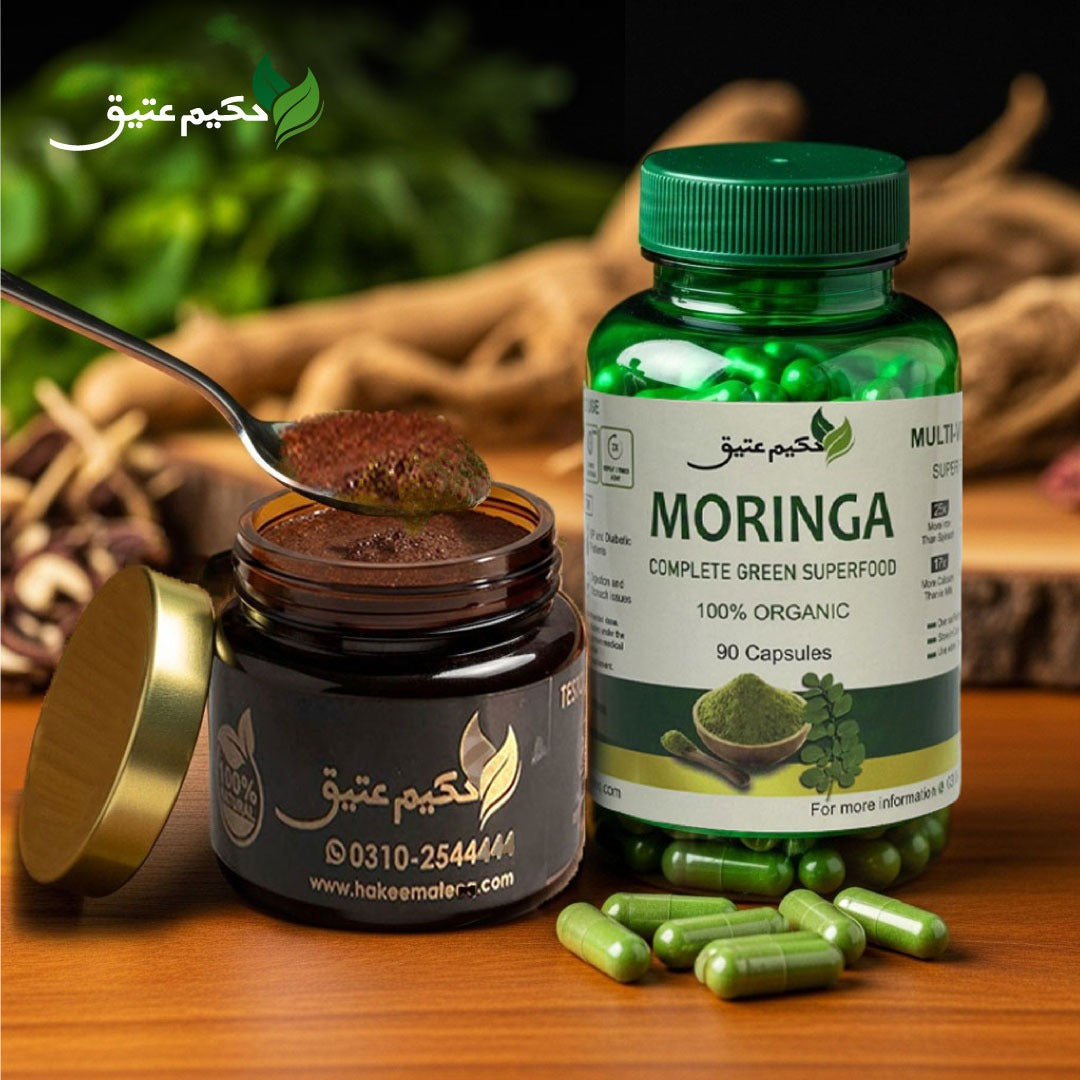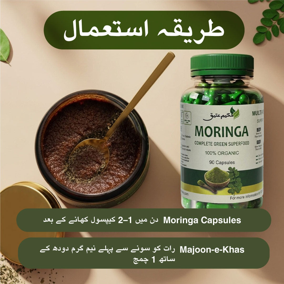This combo is a perfect synergy of herbal performance and nutritional excellence. While Majoon-E-Khas Shahi Gold supports your energy, drive, and physical strength, the Moringa Capsules ensure your body is nourished with essential nutrients to stay healthy, resilient, and energized.