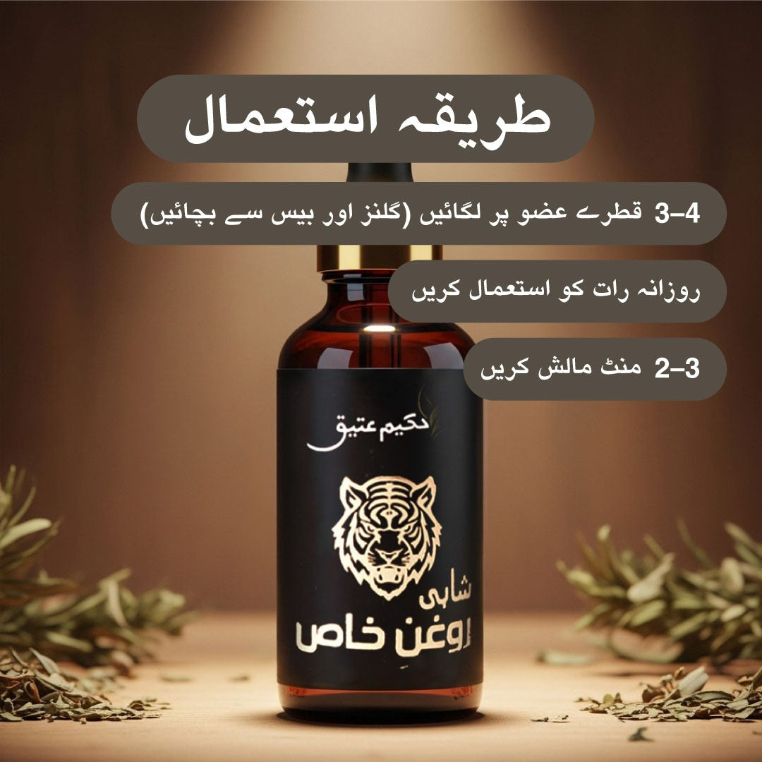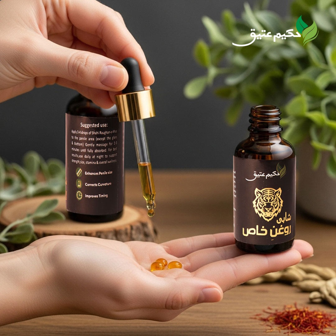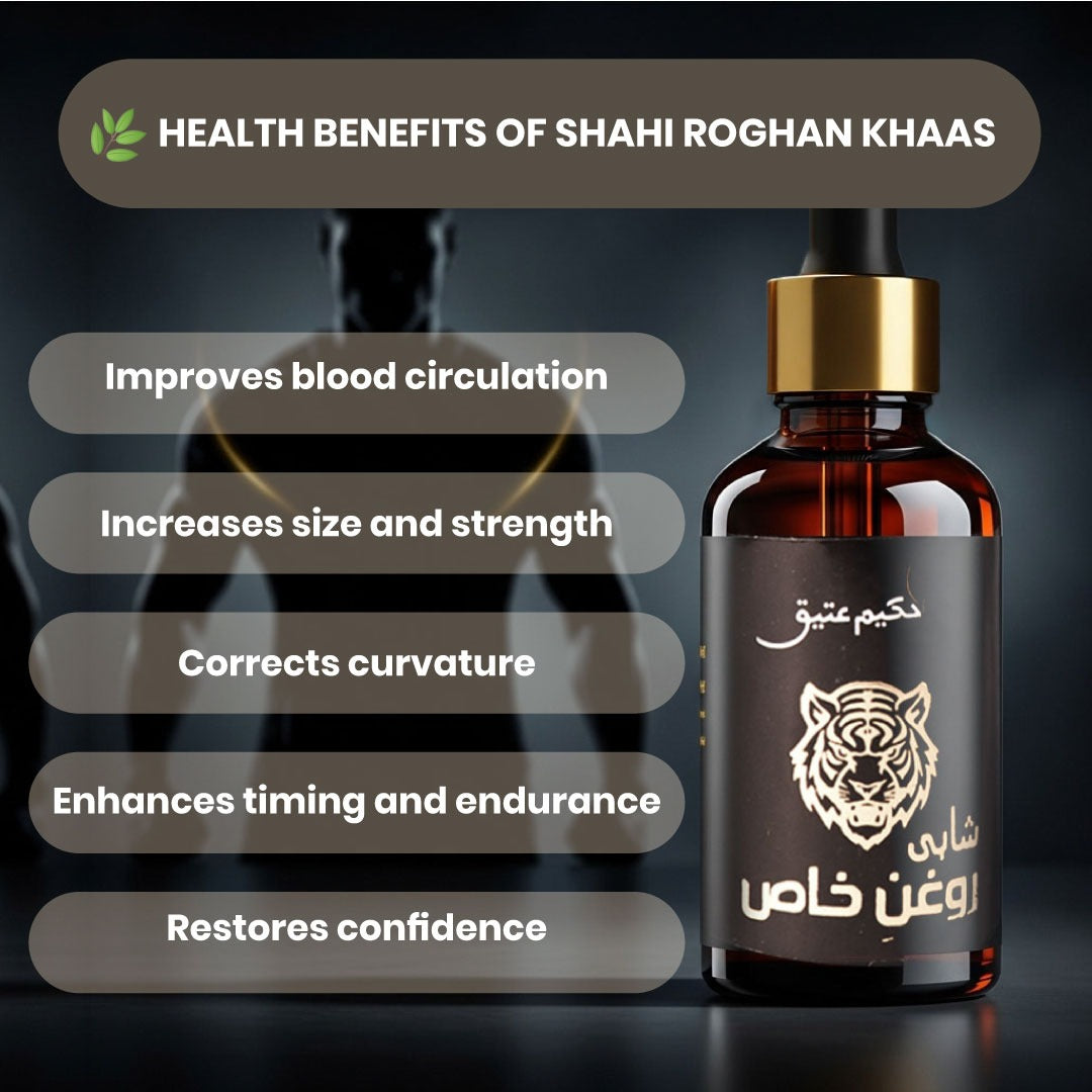 Shahi Roghan-e-Khas is a time-tested herbal formulation crafted to support male vitality, strength, and confidence. Made from potent natural ingredients, this oil works by enhancing blood circulation, strengthening veins, and aiding recovery from fatigue — helping you perform your best with renewed energy.