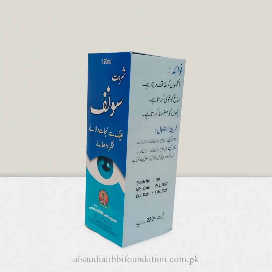 Sharbat Sonf, manufactured by Al-Saudia Tibbi Foundation, is a traditional herbal drink formulated to support eye health and improve vision. Infused with Sonf (Fennel Seeds) and other natural ingredients, this refreshing beverage aims to enhance eyesight and reduce dependence on corrective eyewear.